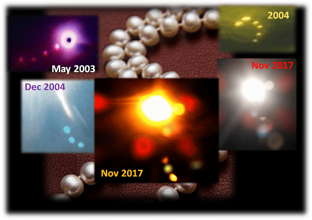 Per the Zetas of ZetaTalk, these moons follow each other in a line, arranging themselves into what appears to the eye (or camera) as a “string of pearls.” It first showed up in 2003-2004, as Planet X (Nibiru) approached the sun.