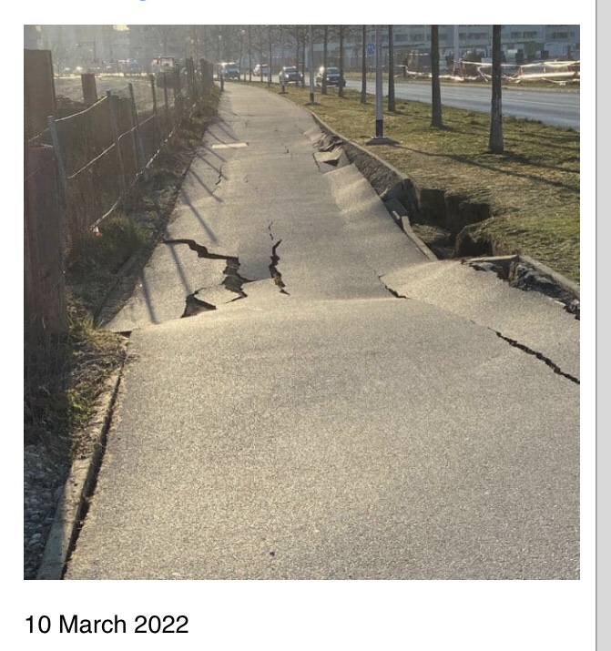 Wednesday, March 9, 2022 – Citizens of Zagreb, Croatia, are not only concerned about the sidewalk collapse on Antuna Šoljana Street, but a similar collapse occurred at a nearby construction site on the same day, when the ground broke off on one side and slid down the slope, taking concrete sections with it that leaned downward as a result.