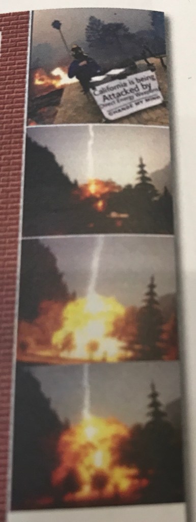 Below actual photographs taken during the morning of the Paradise fires (from James Lee’s book). They have not been retouched. Even though most lasers are invisible to the eye, blue beams can clearly be seen because the air is excited by the microwave weaponry, as well as soot and dust being kicked up, thus allowing the laser to make blue light visible.