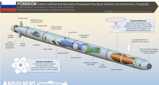Poseidon’s warhead can contaminate a large area with radiation. For this reason, the Poseidon is speculated to be equipped with a cobalt bomb and could be used as a radiological second-strike weapon.